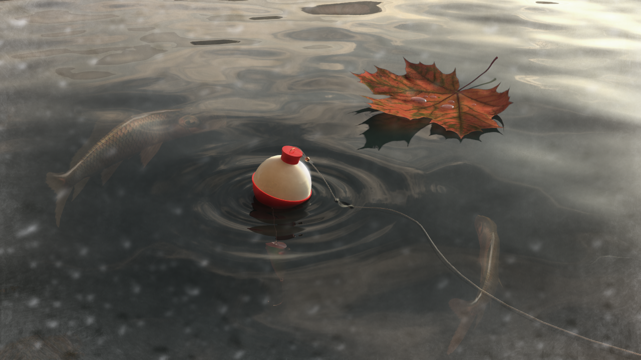 I really wanted to produce something with water and ripples. This 3DS Max still was a good way to play with rendering water refraction and reflection. Nothing intense. No Vray in this one. Just mental ray. Opacity map on the leaf. The fish are modeled, albeit quite simply since their image would be refracted through the water. Environment map was key for the lighting in this scene. The part where the fishing line touches the water, I just photoshopped that based on references because ain't nobody got time for that. A little color correction and "lens dirt" comped into the final with PS.